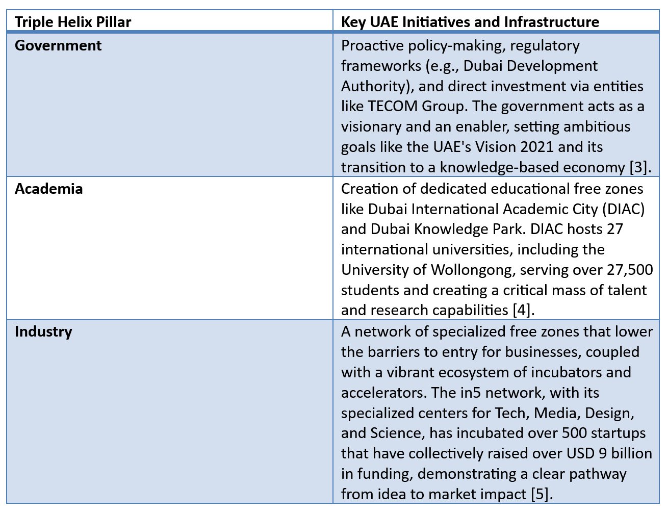 My time in Dubai, particularly at the in5 incubator, provided a ground-level view of how this integration is achieved. The ecosystem is not an accident of history but the result of deliberate, long-term architectural planning. Each pillar of the Triple Helix is supported by world-class infrastructure and incentive-driven policies.